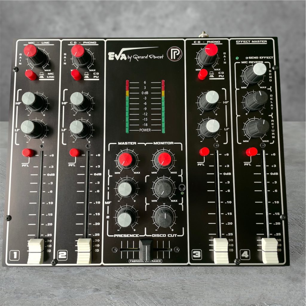 Dans un format réduit cette table de mixage dispose de deux entrées stéréo pour platine CD commutables en Platine Phono et d’une entrée pour microphone. Chaque entrée possède un réglage de gain, un correcteur à deux fréquences, d’une pré-coute solo et d’un fader longue course. S’ajoute à cet ensemble une entrée ligne stéréo équipée d’un fader longue course et d’un module de réverbération. Toutes ces entrées sont dirigées sur deux sorties Master et Monitor avec un correcteur de présence ainsi qu’un correcteur Disco-Sound pour le renforcement des graves (SUB/BASS). Une prise d’insertion sur les voies de sorties est prévue pour le raccordement d’un périphérique extérieur (limiteur,..) Pour les amoureux du scratching, un Cross-Fader vient compléter cette mini console qui a tout d’une grande