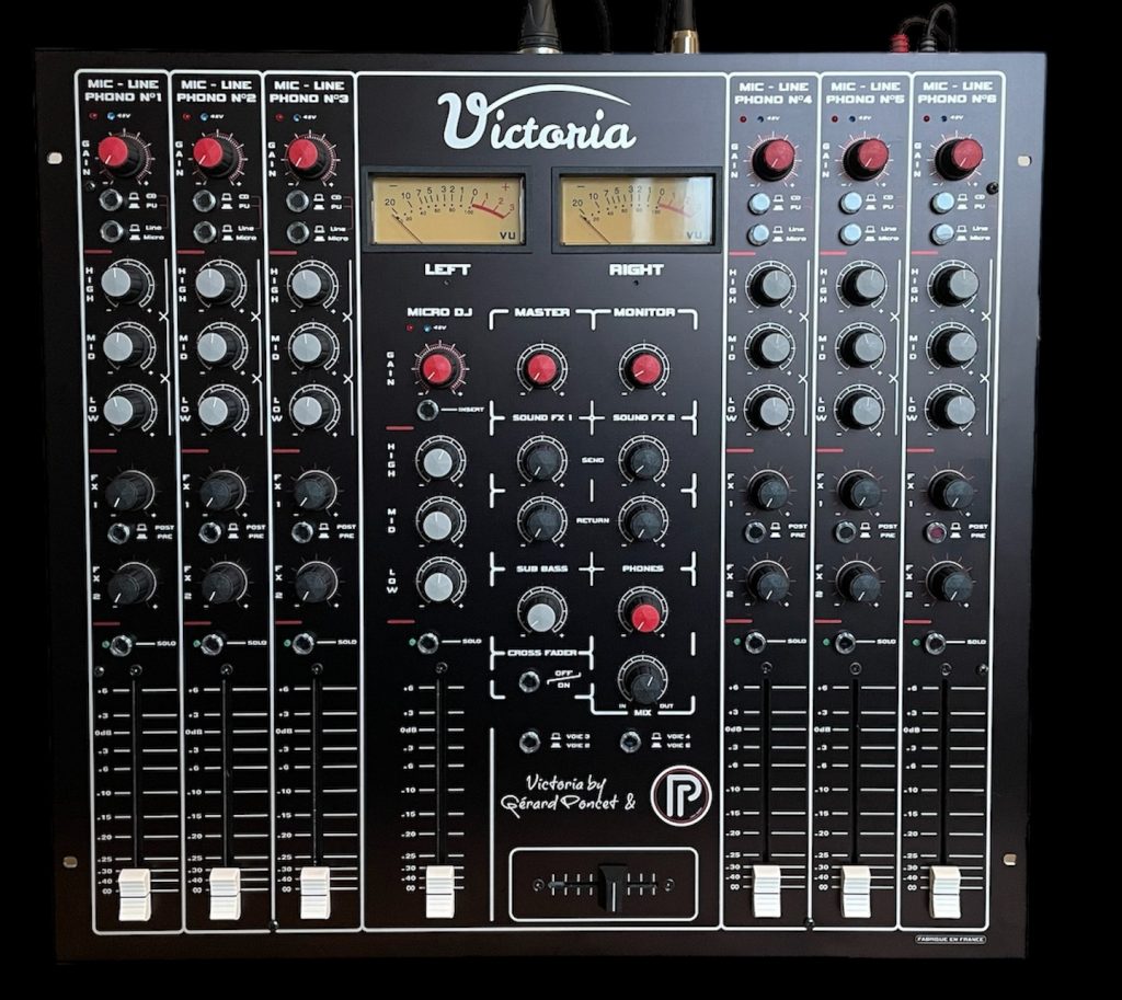 La particularité de cette console semi modulaire réside dans le fait que chaque entrée est universelle et permet de raccorder au choix de l’utilisateur un Micro, un lecteur CD ou une platine Phono. Autre particularité, départ effet avant et après fader et assignation du cross-fader entre les voies d’entrées mono et stéréo. Au niveau de la réalisation un soin particulier a été apporté au niveau des fonctions du choix des composants assurant une fiabilité dans le temps. Victoria est une table de mixage entièrement analogique qui s’inscrit parfaitement dans des prestations de haut niveau (concert publique, soirées privée ou prise de son et enregistrement).